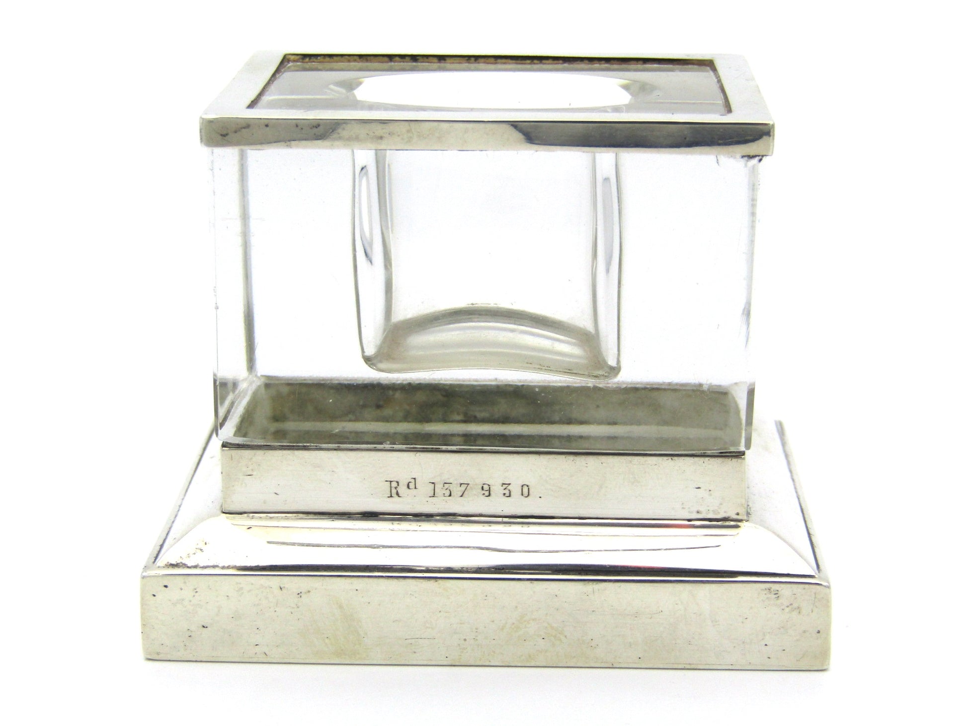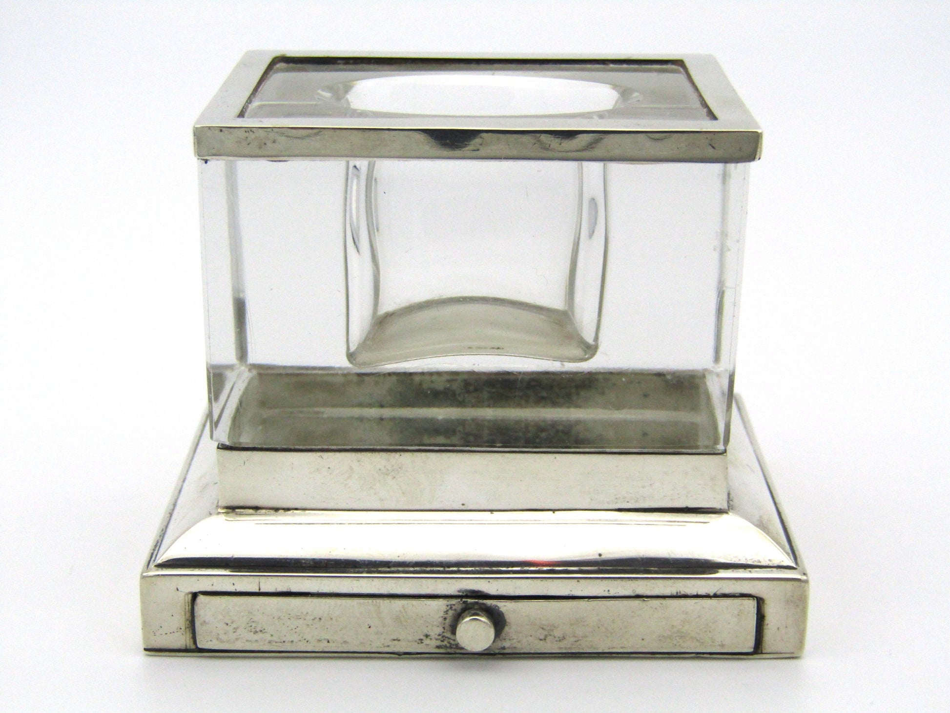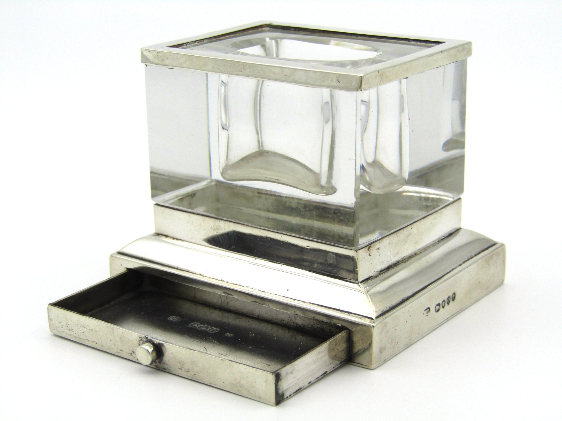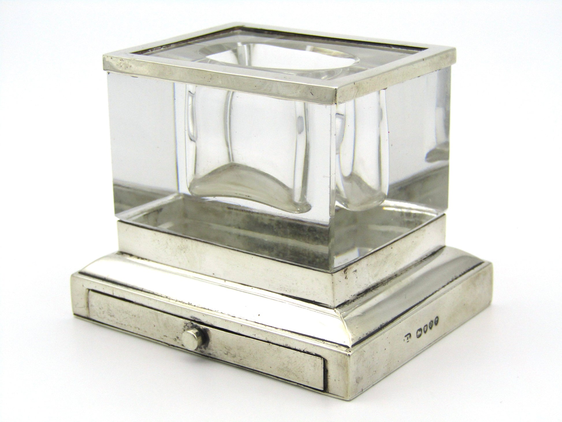 A rare and collectible stamp box made with a sterling silver bottom complete with a drawer, with a glass stamp dip and a silver rim at the top. A one of a kind piece! (Please note: there is a small chip on the glass at the back on the top right as per the photos).