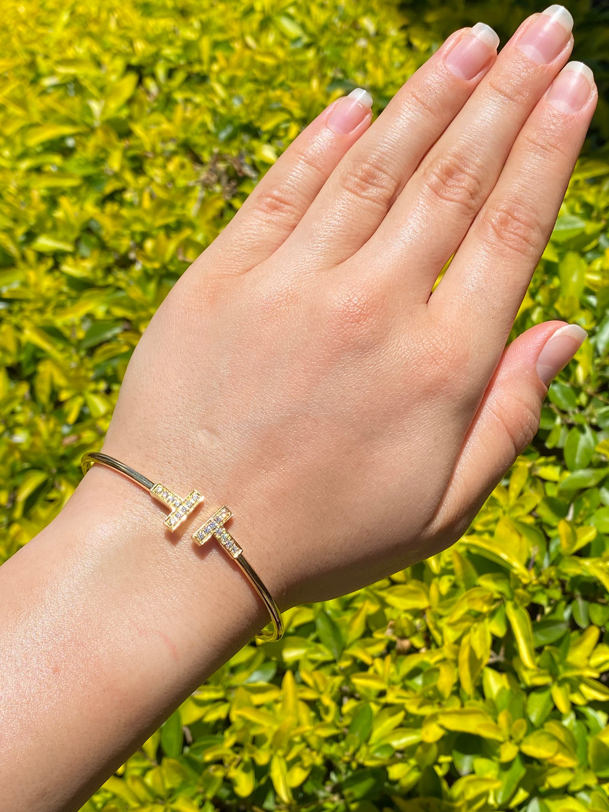 Inspired by an archival bracelet from 1975, T is an homage to the Tiffany house's iconic motif and the spirit of New York. A classy bendy bracelet with two letter T's set with only the whitest and brightest of diamonds. A timeless addition to any jewellery closet.