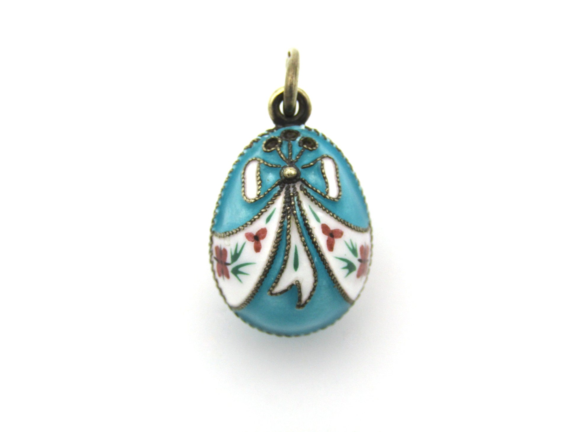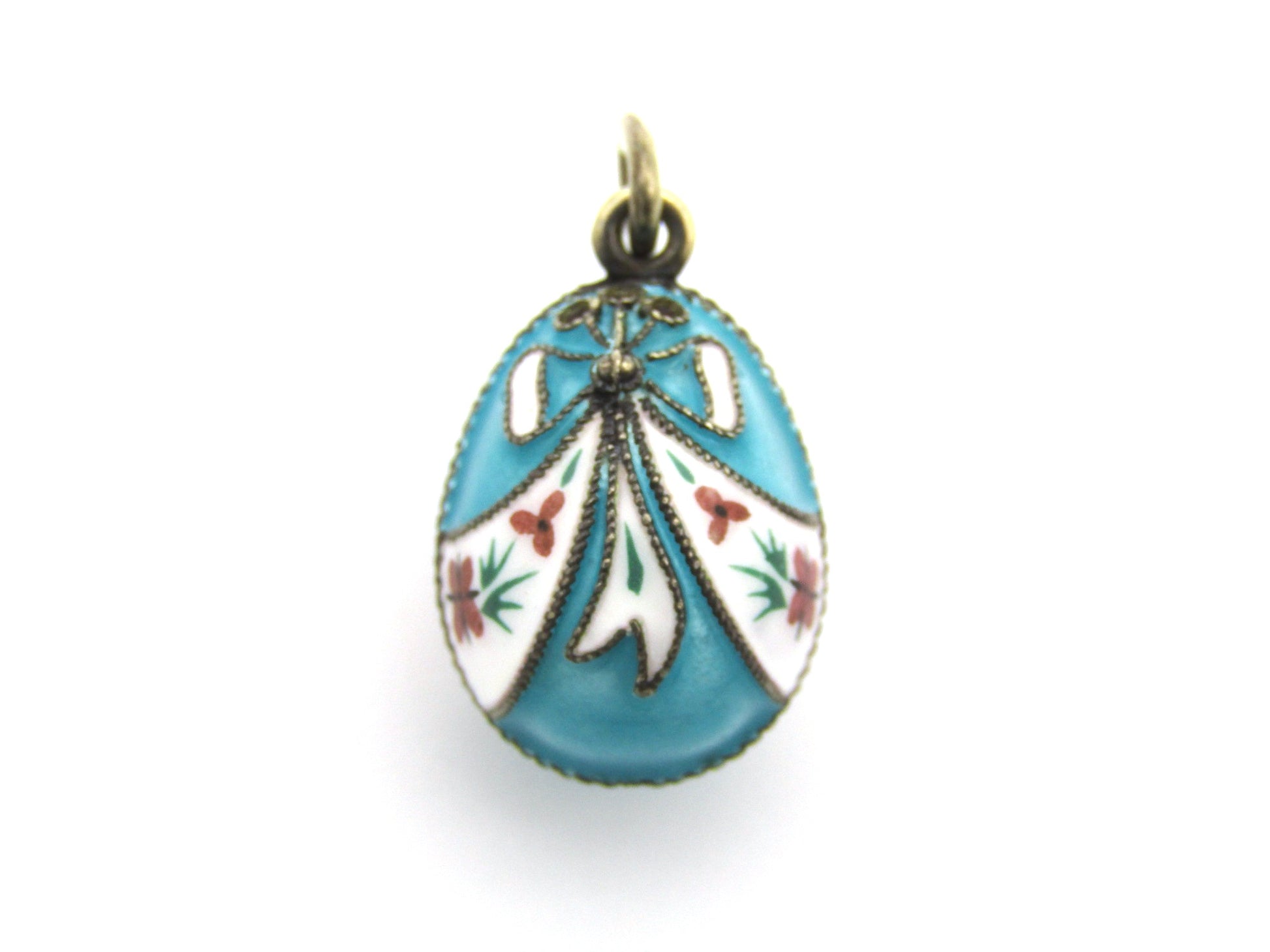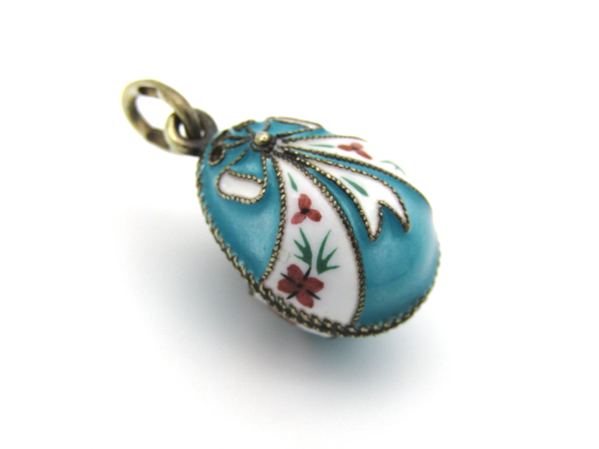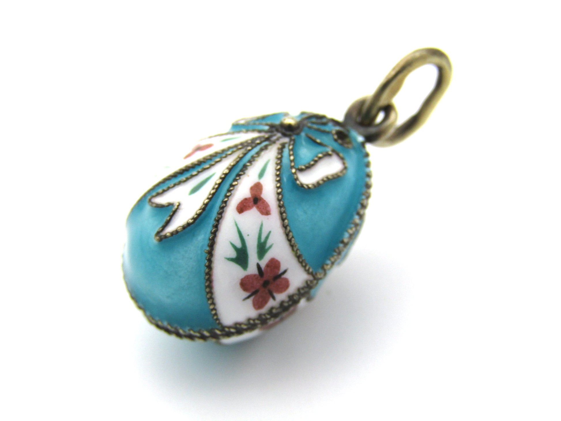 A beautiful little pendant to be treasured, this little egg has been crafted in sterling silver and overlaid with gold, and has been adorned with cloisonné enamel in bow designs with floral and foliate enamel painting. Made in Russia circa 1960's, these little egg pendants are much sought after and the perfect little gift for someone who loves history! (Chain is excluded and is used for illustrative purposes only).