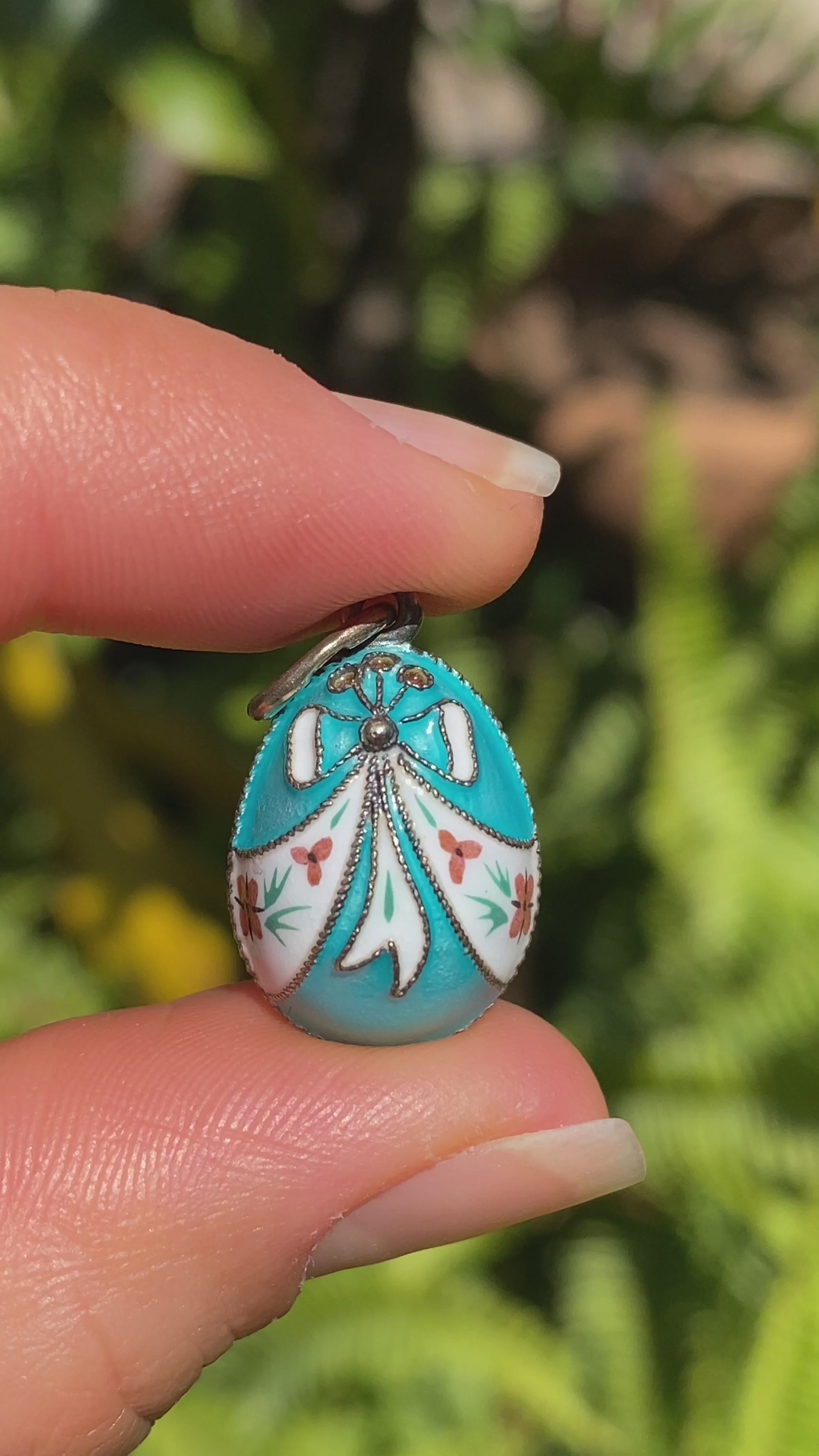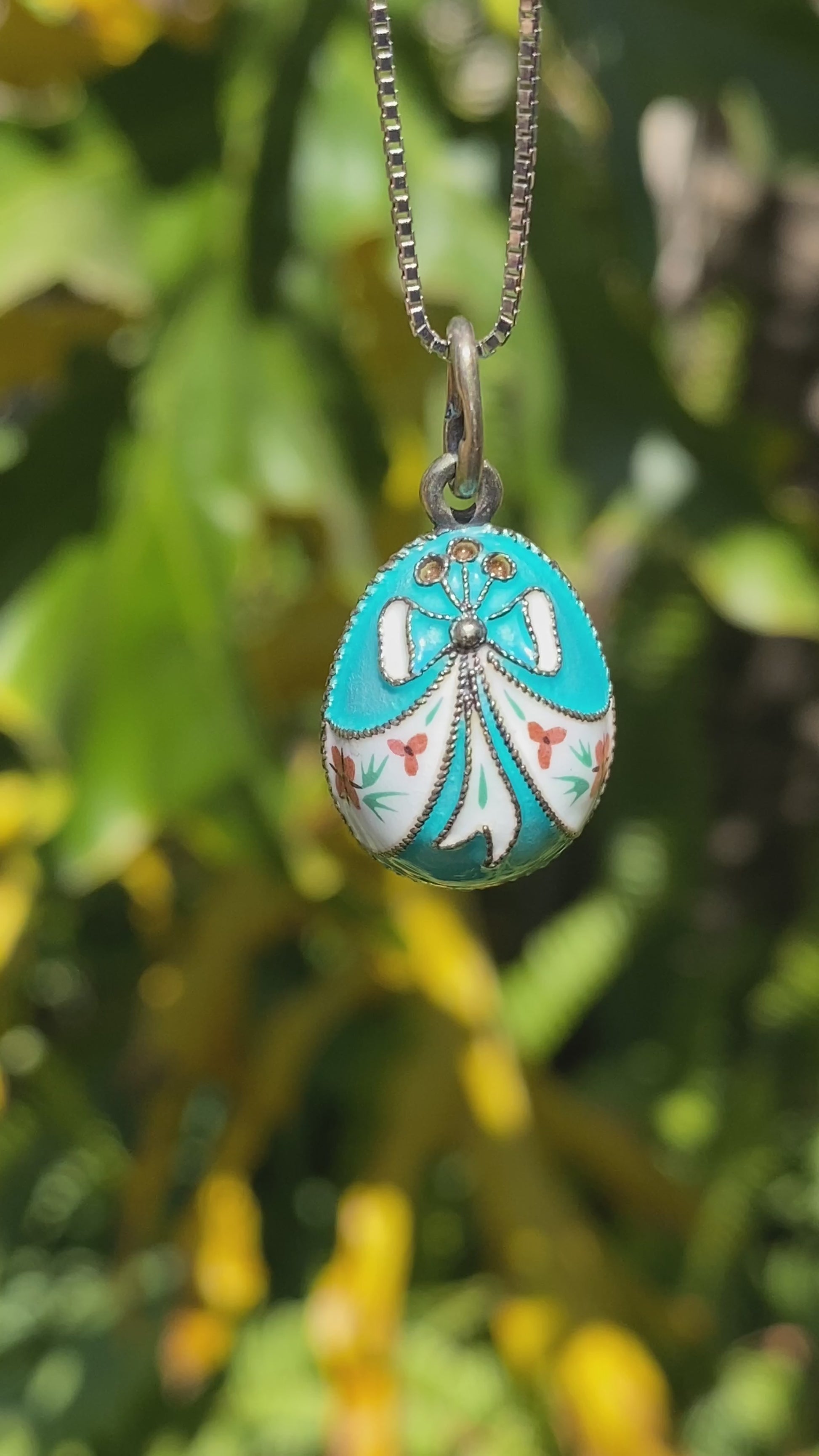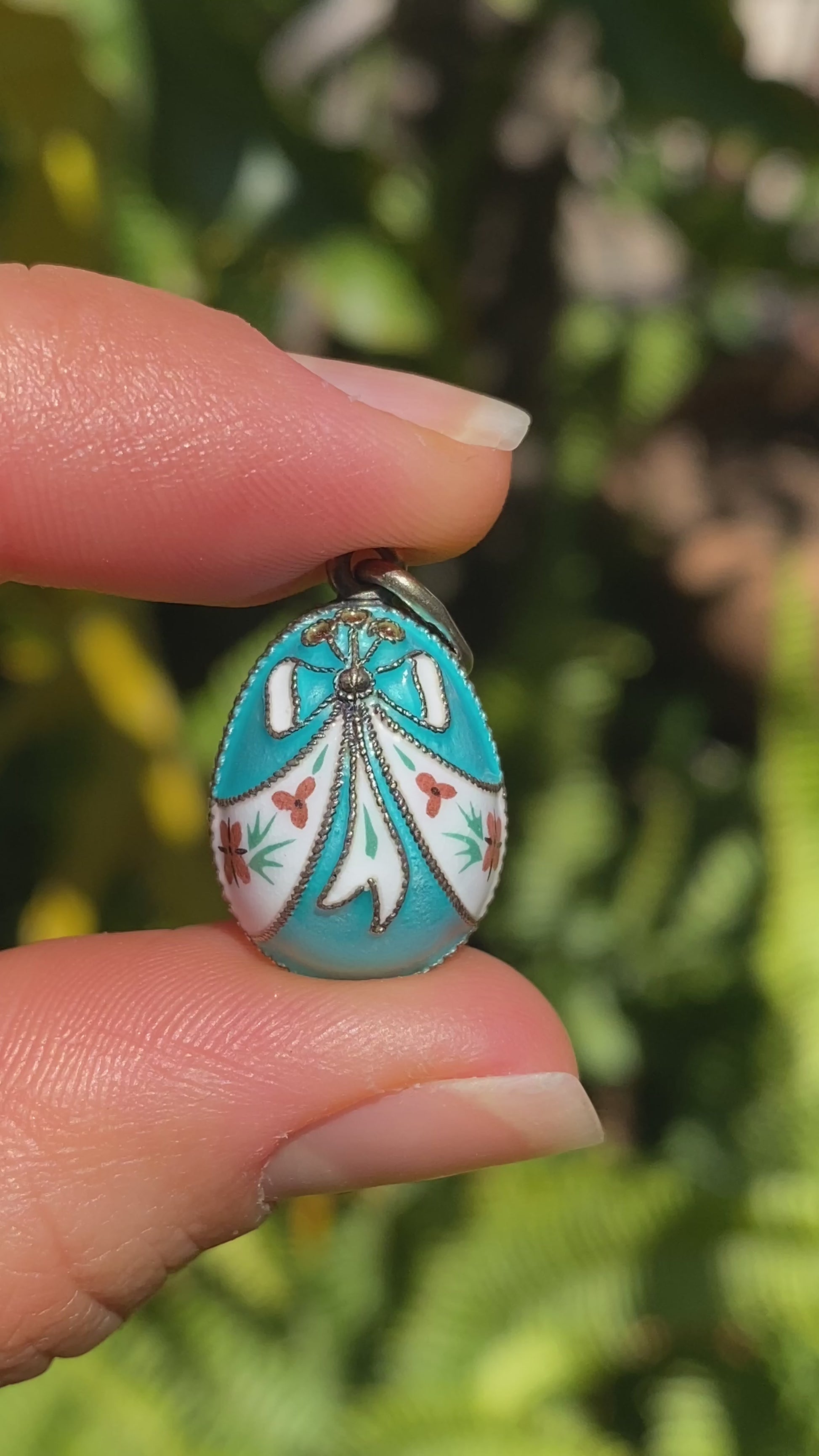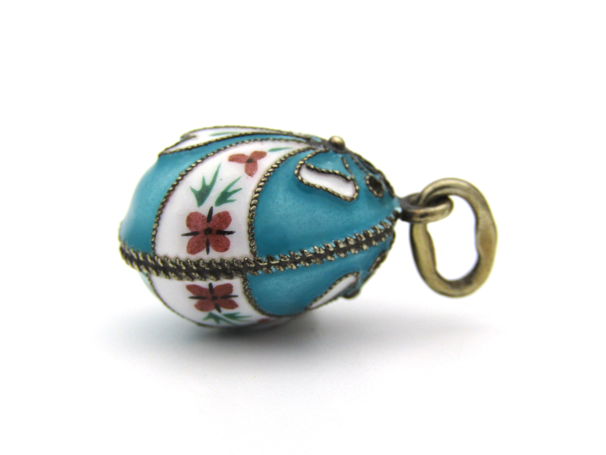A beautiful little pendant to be treasured, this little egg has been crafted in sterling silver and overlaid with gold, and has been adorned with cloisonné enamel in bow designs with floral and foliate enamel painting. Made in Russia circa 1960's, these little egg pendants are much sought after and the perfect little gift for someone who loves history! (Chain is excluded and is used for illustrative purposes only).